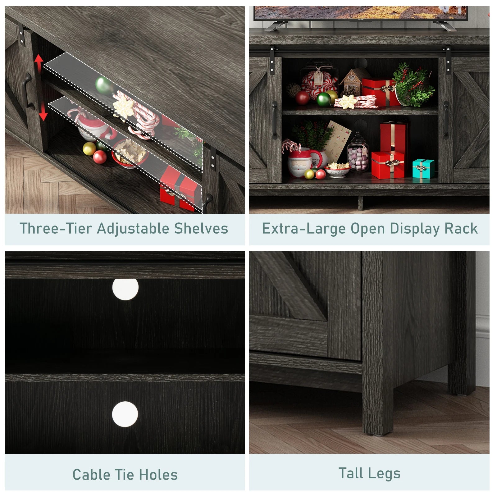 Farmhouse Rustic Entertainment Center The TV stand with storage cabinet featured two sliding barn doors for a blend of open and closed storage. Sliding barn doors and their flexibility allow easy access to all cabinets. Beyond its functionality, the symmetrical design with the finest wood grain also matches the rustic sense of style in your living room.