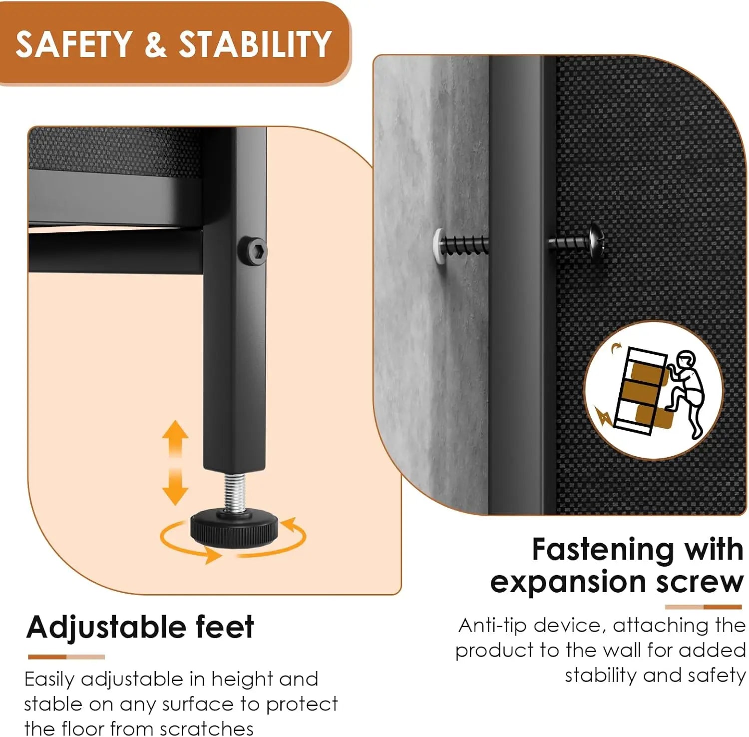 STURDY & STABLE Fabric storage tower consists of steel frame and wooden top plate. Metal and wood are tightly connected together with screws. Metal iron rod with cross-back design further improves the stability of the overall frame. In addition, each leg has an adjustable foot pad design, which can adapt to uneven ground while protecting the floor. We are also equipped with expansion screws used to connect with the wall, which can effectively avoid accidental tipping.