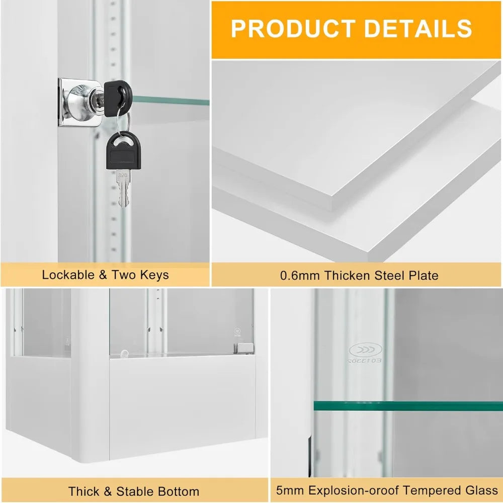 Durable and Lockable for Secure Storage Crafted with 5mm tempered glass and reinforced cold-rolled steel, this glass cabinet display case ensures exceptional durability and stability. Each shelf supports up to 44lbs for heavy items. The included lock and key provide added security, keeping your valuables safe while maintaining a sleek, wobble-free display.