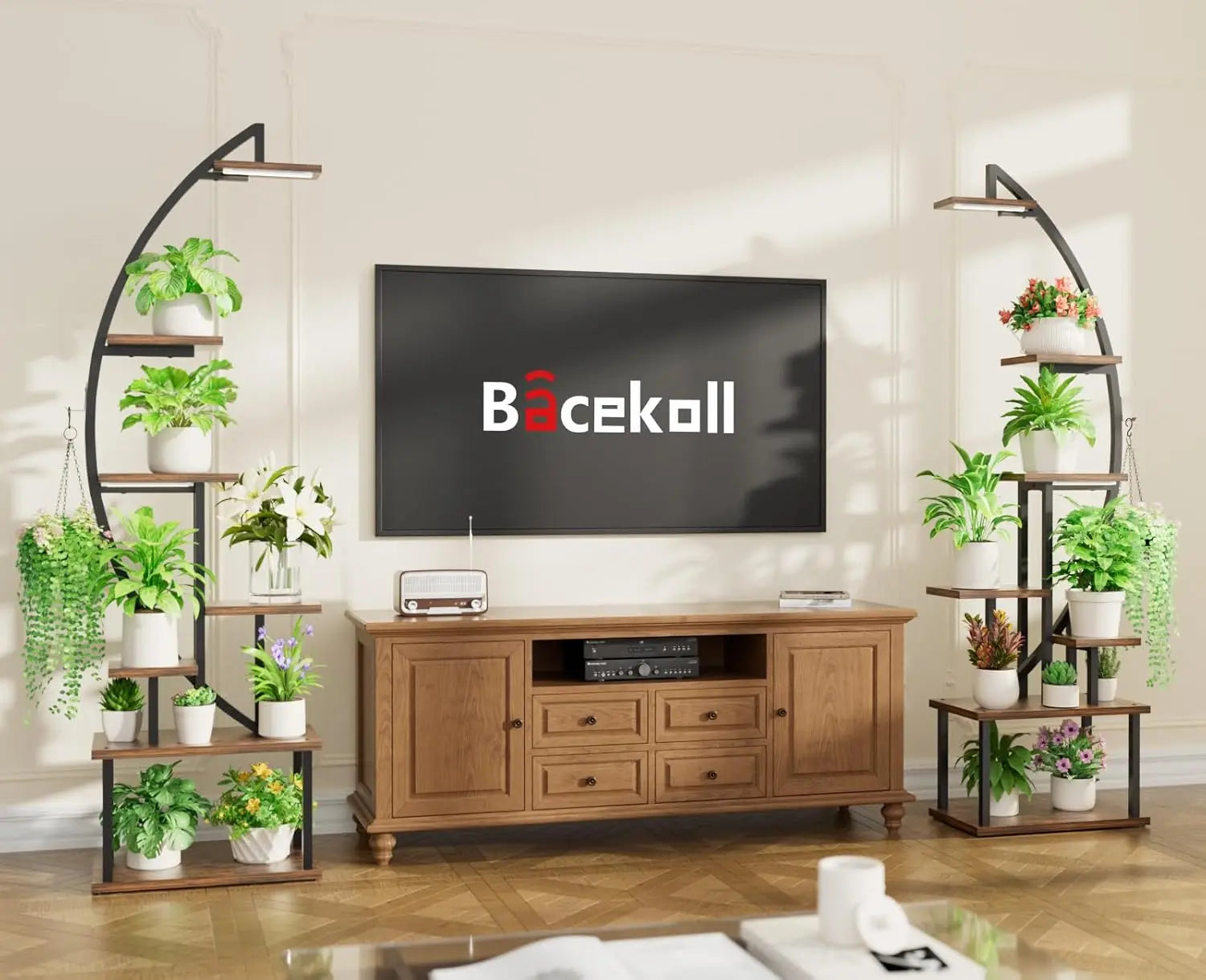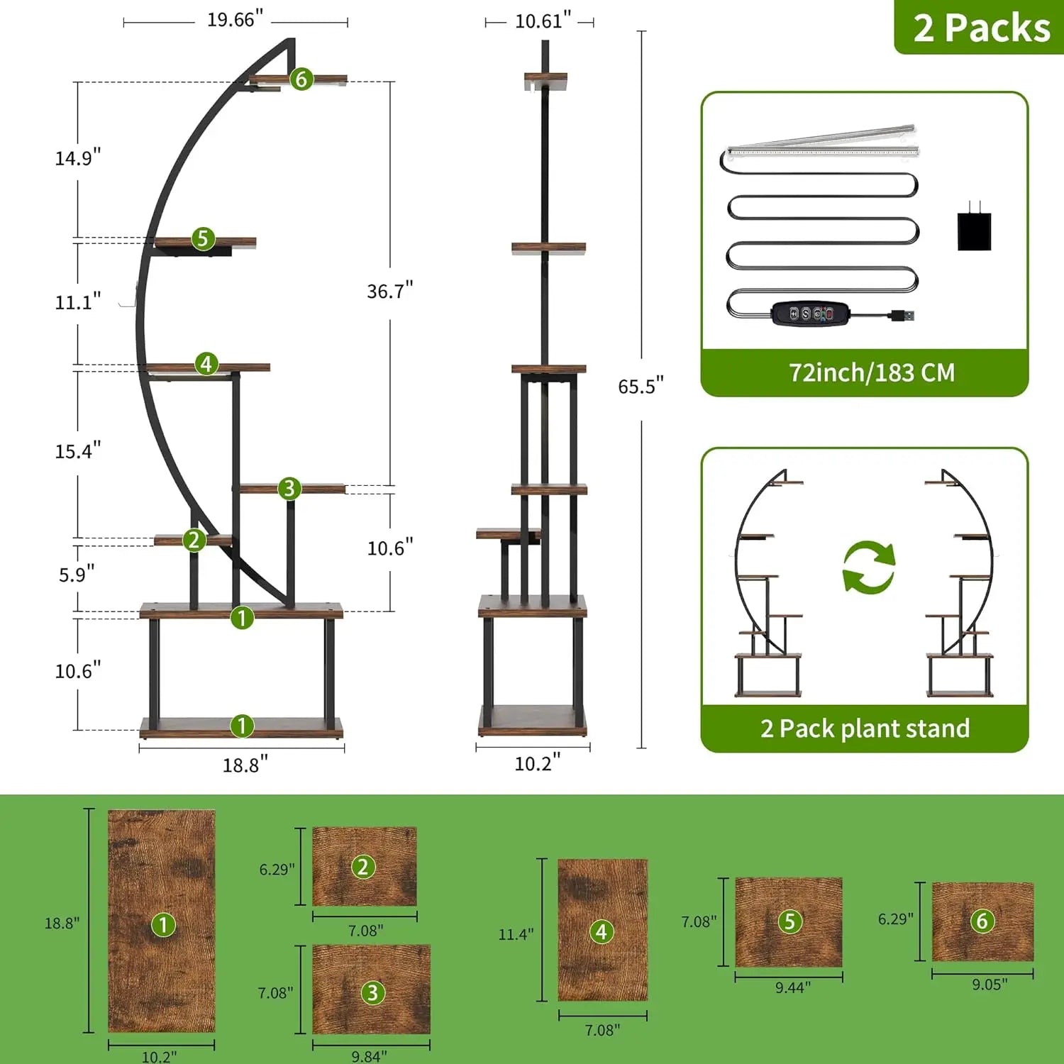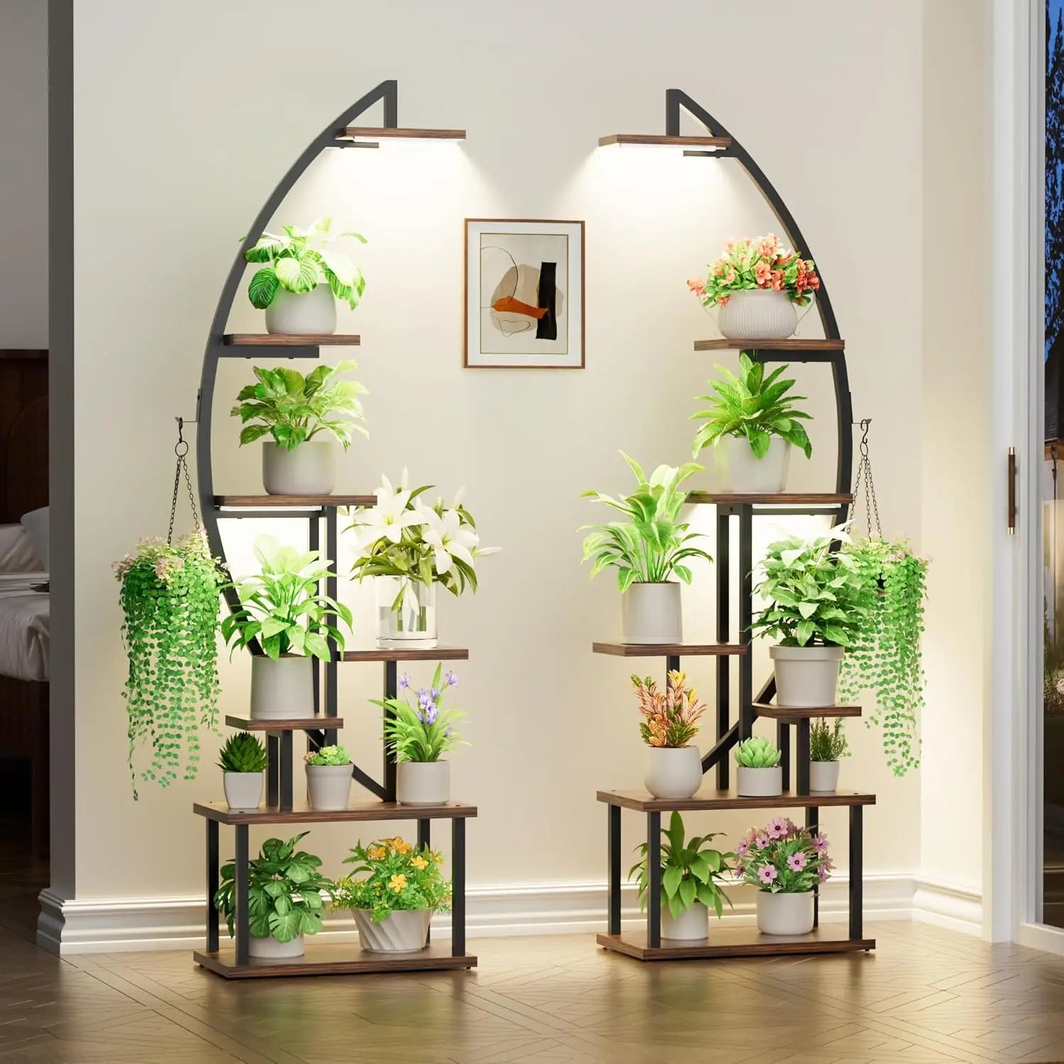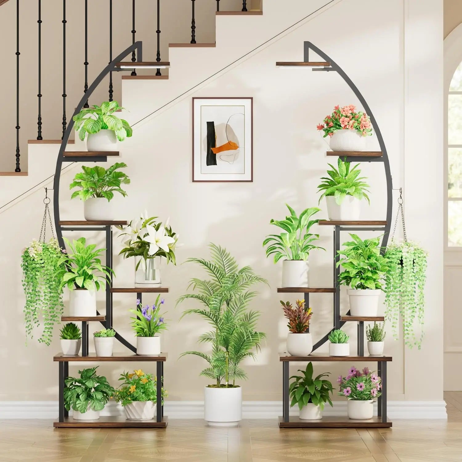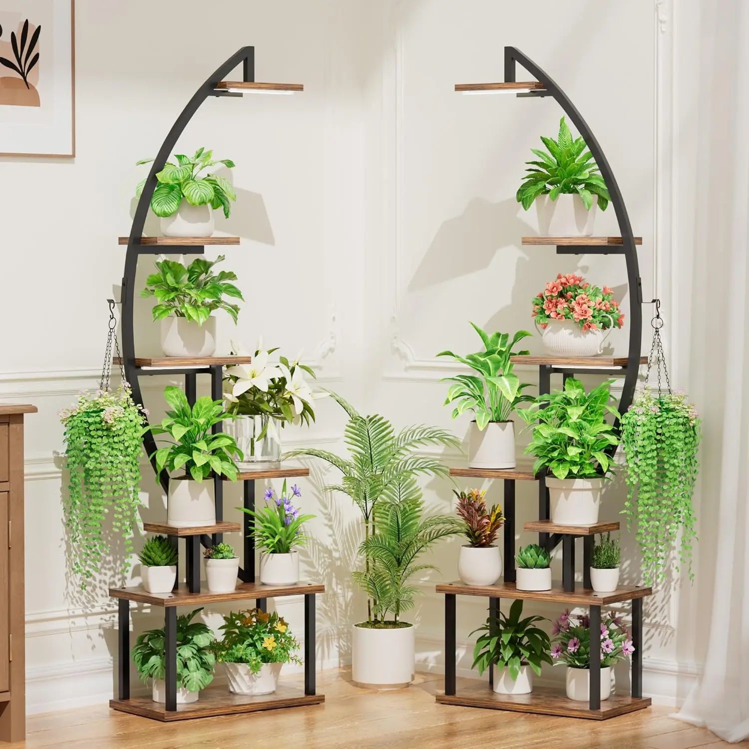 Great Present for Plant Lovers Designed with a curved shape like the half-moon, this floor plant stand with light (includes two shelves) is a unique and artistic addition to your home beauty.