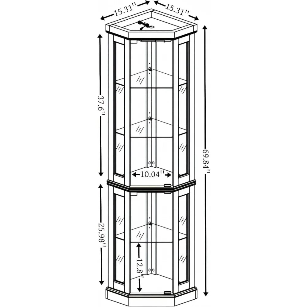 Plenty of Gorgeous Display Space Featuring 2 glass pane doors, 3 glass panels, and 5 triangular corner shelves divided into two sections. Shelves are adjustable. An included light adds flair and illumination to your displays. Mirrored back panels create a grand showcase.